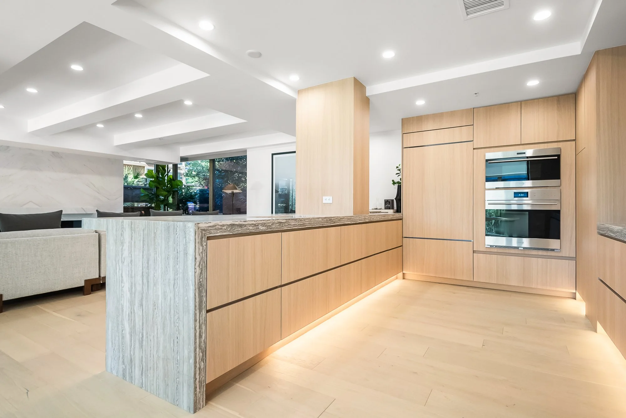 In our Scottsdale projects, we often use contemporary wood veneers designed for modern architecture. These allow for precise color control and grain matching across large expanses of cabinetry. This level of consistency creates a seamless look that feels quiet, restrained, and elevated.
