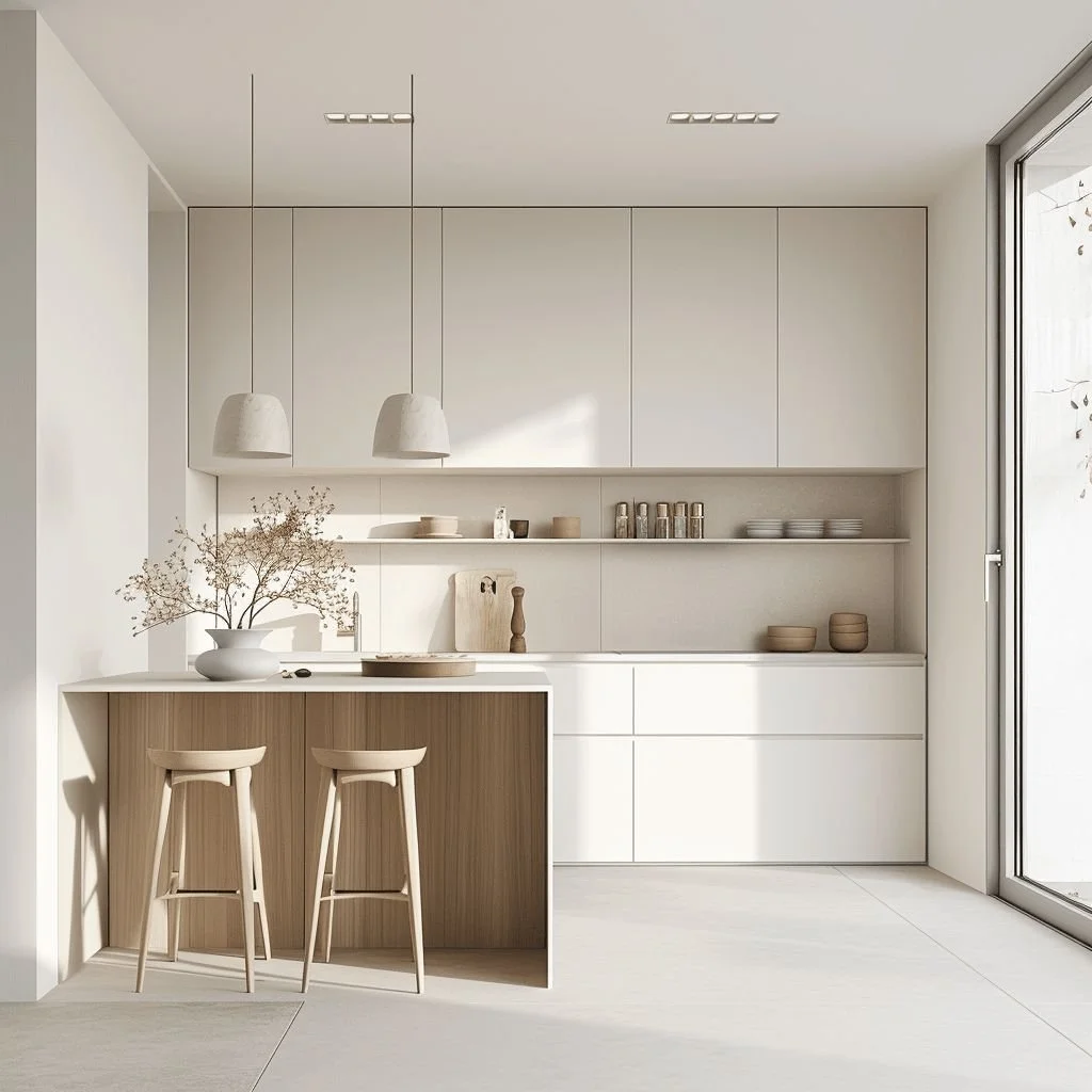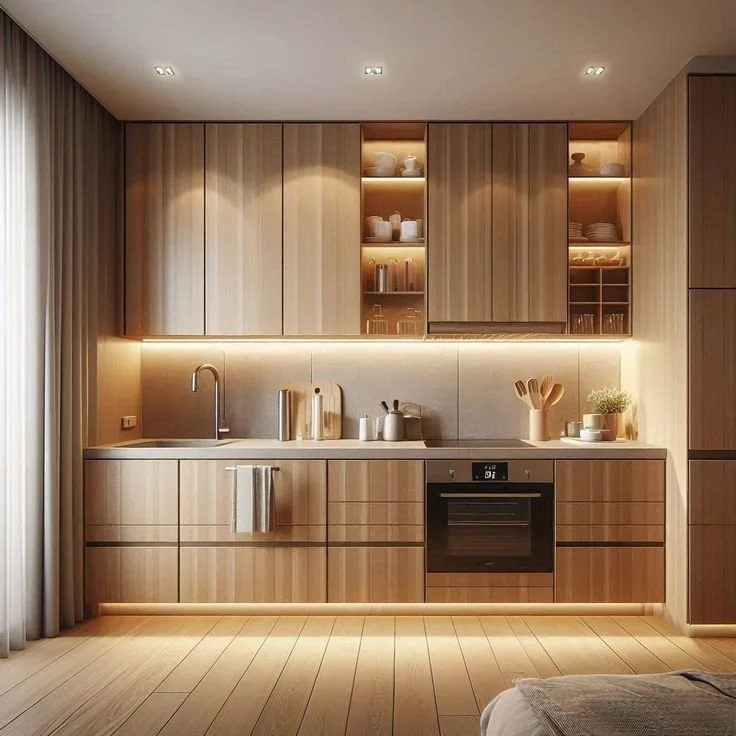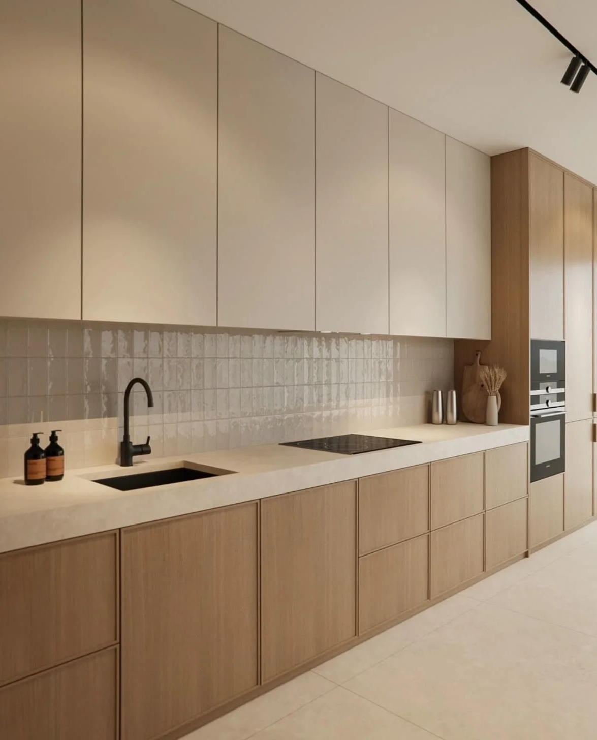 High-gloss can feel overwhelming in small spaces. Instead, we recommend soft matte finishes and light, textured veneers. White oak, creamy taupe, or warm walnut paired with natural stone surfaces reflect light in a softer way, giving the illusion of more space without losing luxury.